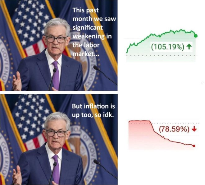 It’s hilarious, in a tragic way: the labor market softens, consumers have less cash, and stocks rip higher. Then earnings season arrives, demand looks tired—and the same crowd gasps, checks notes, that less cash means less spending. Rinse, repeat. Today’s spark? A polite, data-dependent whisper from Powell. No hard promise, just “we’re watching,” yet traders treated it like confetti. Big green candle, victory laps, hedges torched. Meanwhile, the real economy is playing musical chairs: wages struggle to outrun prices, rate-cut hopes slide around the calendar, and housing still feels like an auction where the paddles were pre-sold. Call it the paradox trade—cheering the chill that might cool profits next. As the comic once quipped, we want to wear the sneakers, not stitch them. Same energy here: we want cheaper money without the slowdown that makes it possible. So brace for the sequel. Bad-news rallies are fun until they remember what they’re celebrating. Will this one stick—or is it just another bear trap with better lighting?
